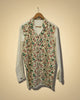 “Bagh ki Diary” is a shirt that feels like a page from a forgotten journal — filled with sketches of wildflowers, jam jars, old trees, and teddy bears waiting in wicker baskets. A rare vintage print paired with sage green sleeves and a Cuban collar, this piece whispers of Sunday mornings, hand-written letters, and peaceful silences under mulberry trees.