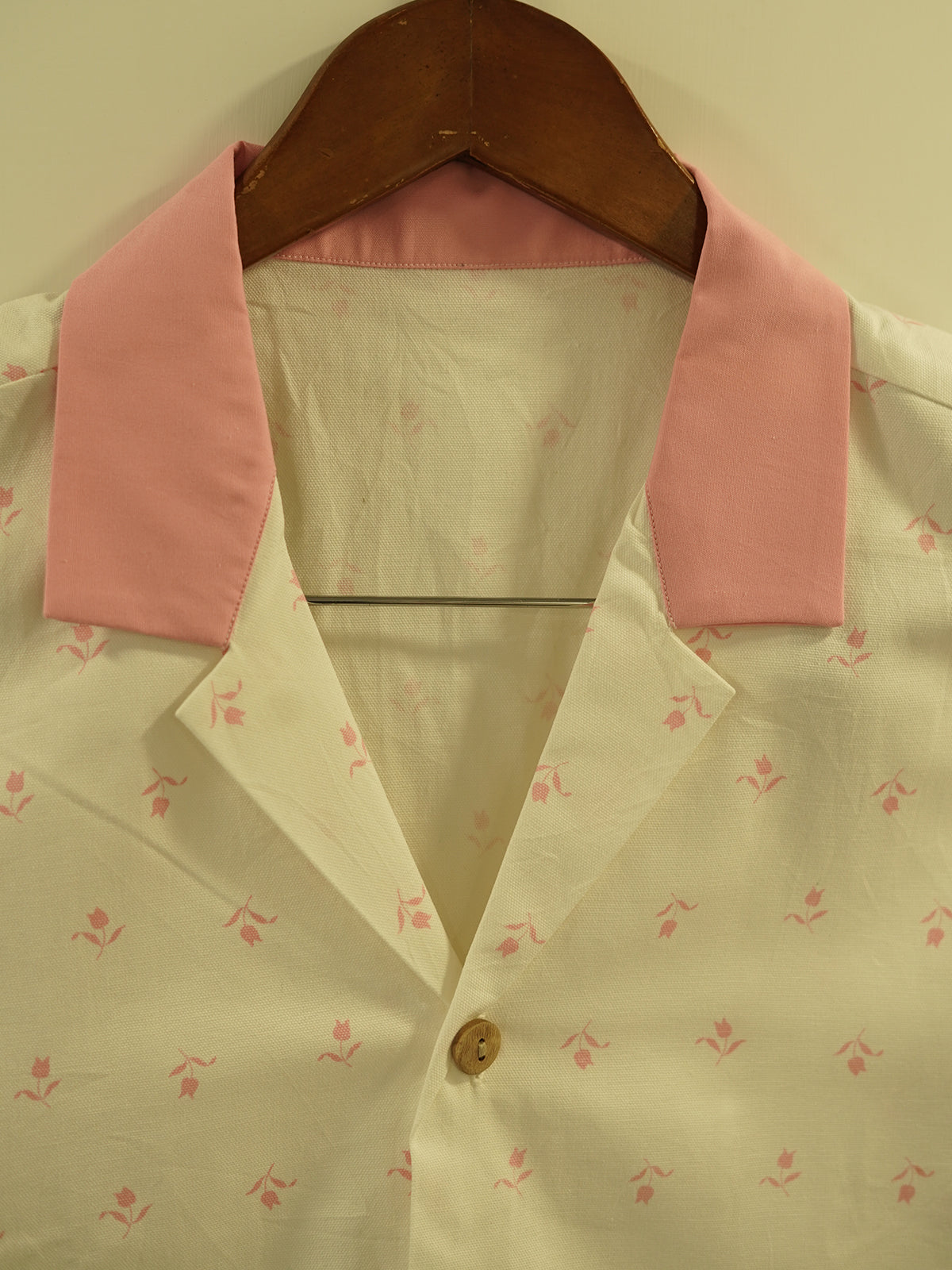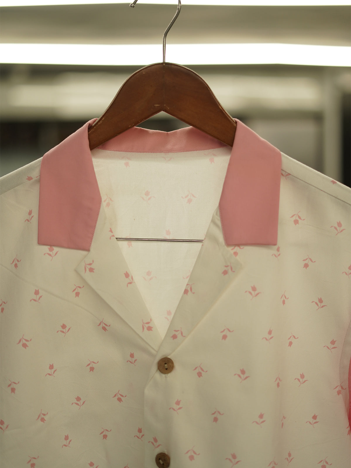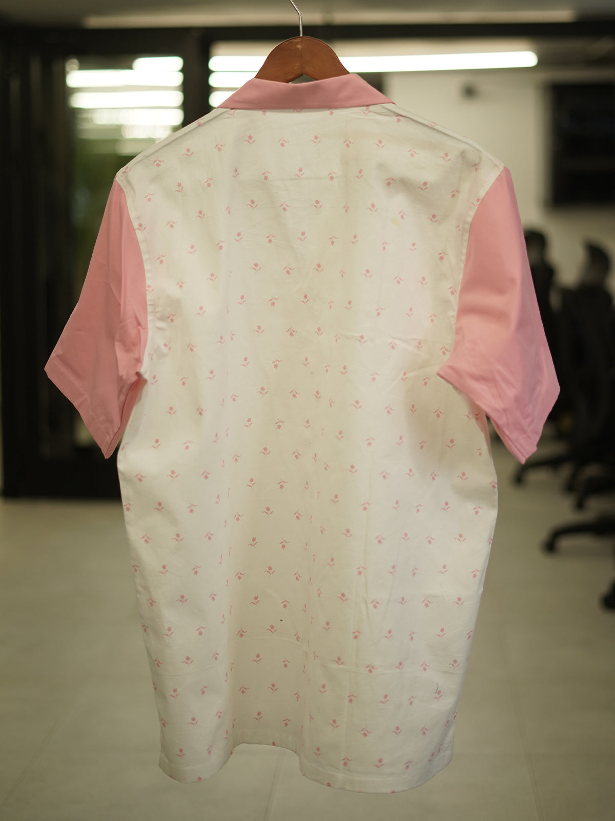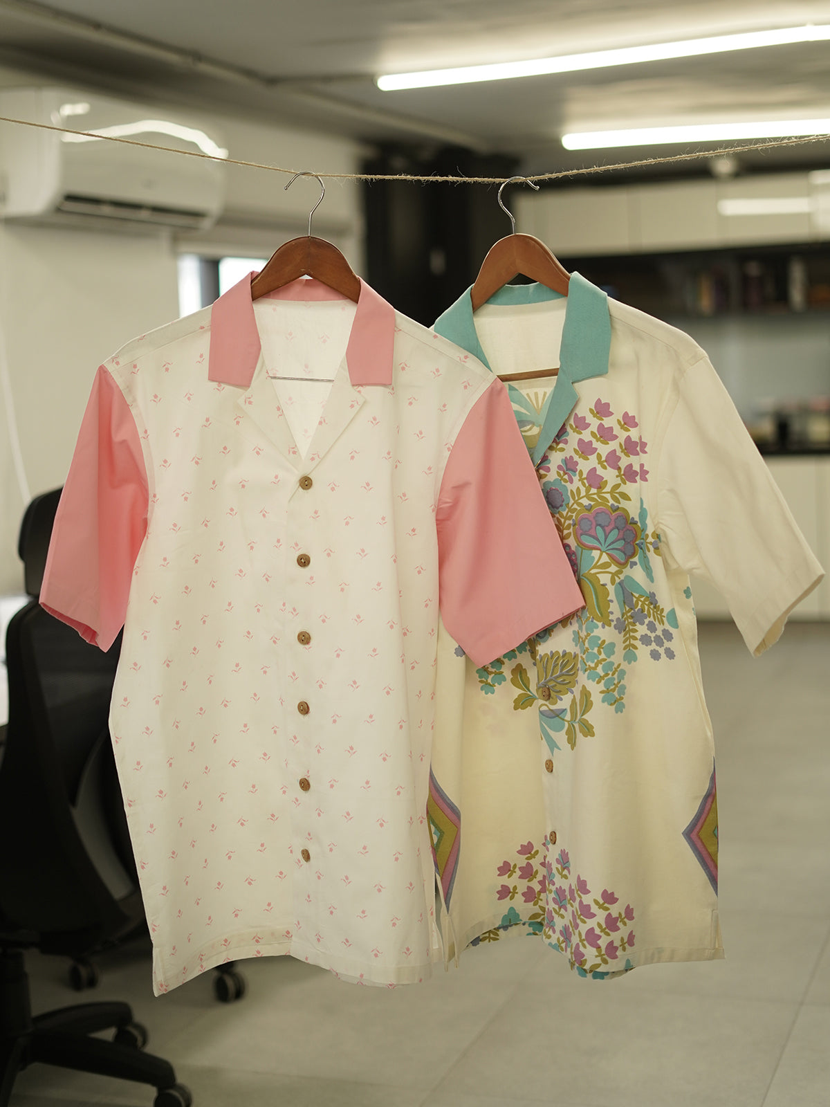 “Gulaabon ka Khat” is a minimalist romantic — a shirt that feels like a faded envelope tucked between pages of a diary. Featuring a tiny rosebud print on warm ivory cotton and framed in soft blush panels, it captures the charm of handwritten notes, first crushes, and quiet Sunday mornings.