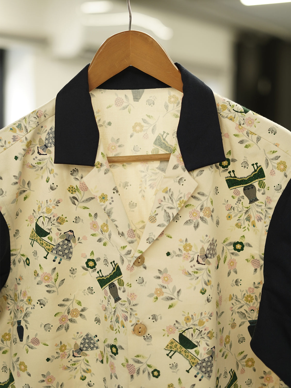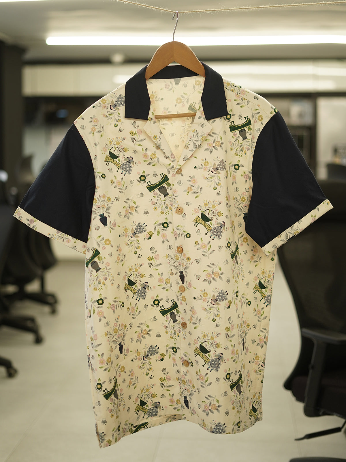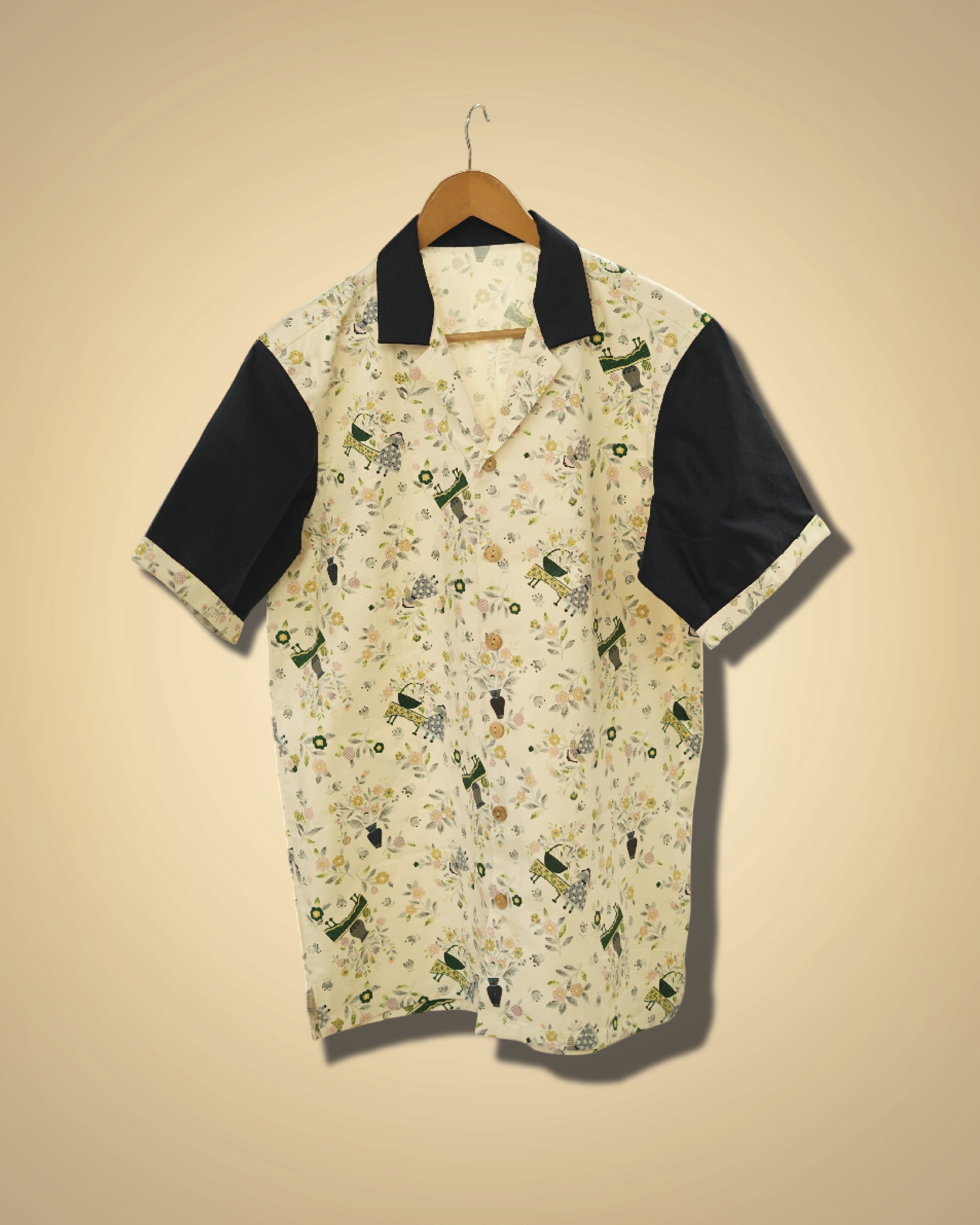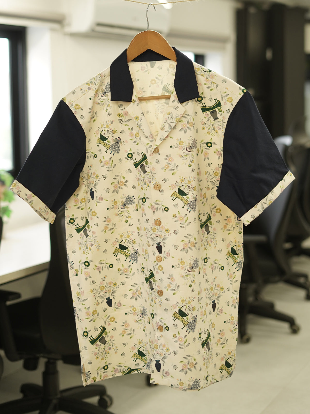 “Bāgh Mein Khala” is a lovingly ironic tribute to our stylish aunties — the ones who matched their dupattas with their lawn sandals, sipped chai with pinky fingers raised, and made time slow down with every garden stroll. This shirt features charming vintage illustrations of seated women, bursting bouquets, and soft botanicals — framed in clean navy accents for that signature edge.