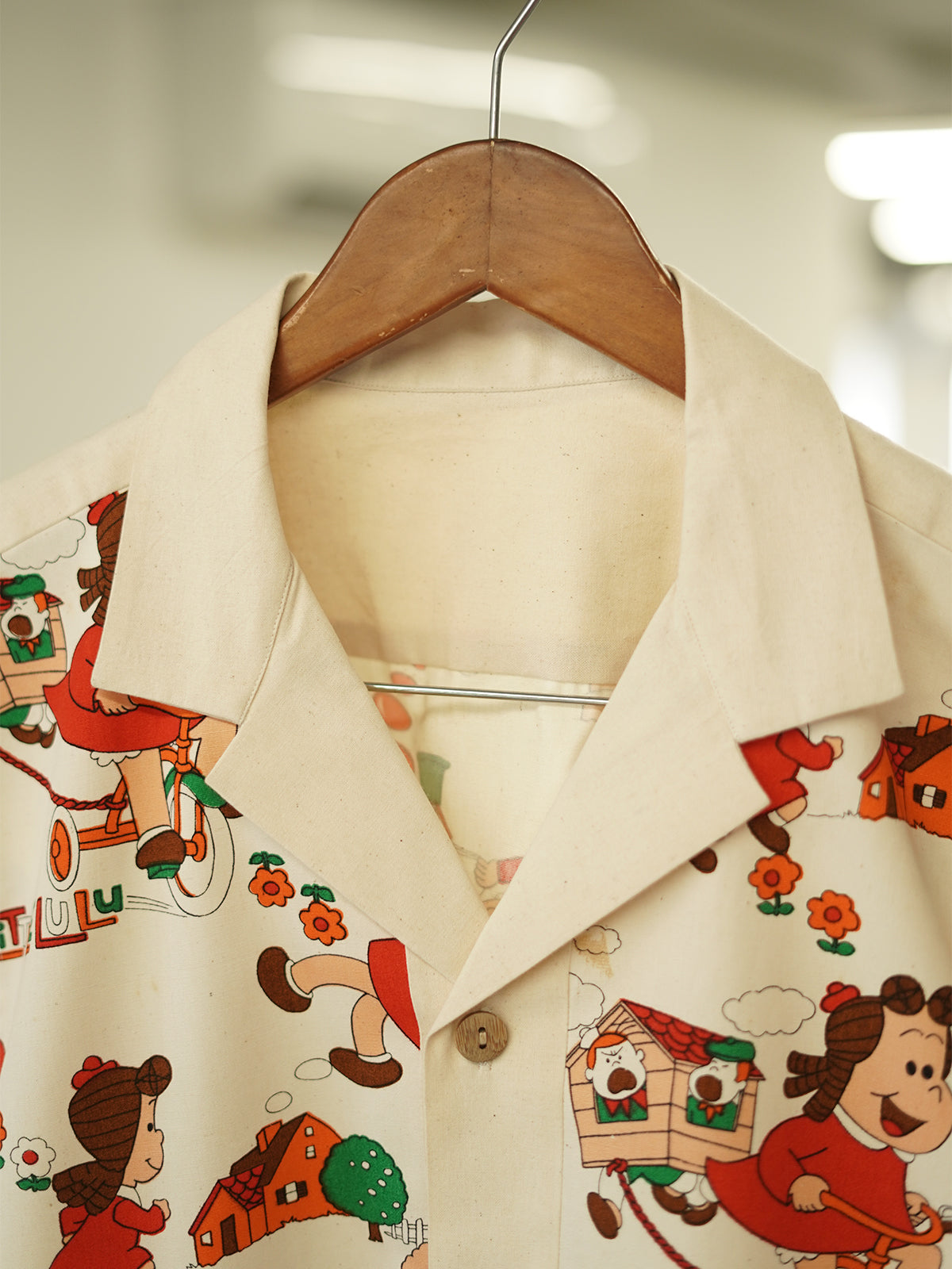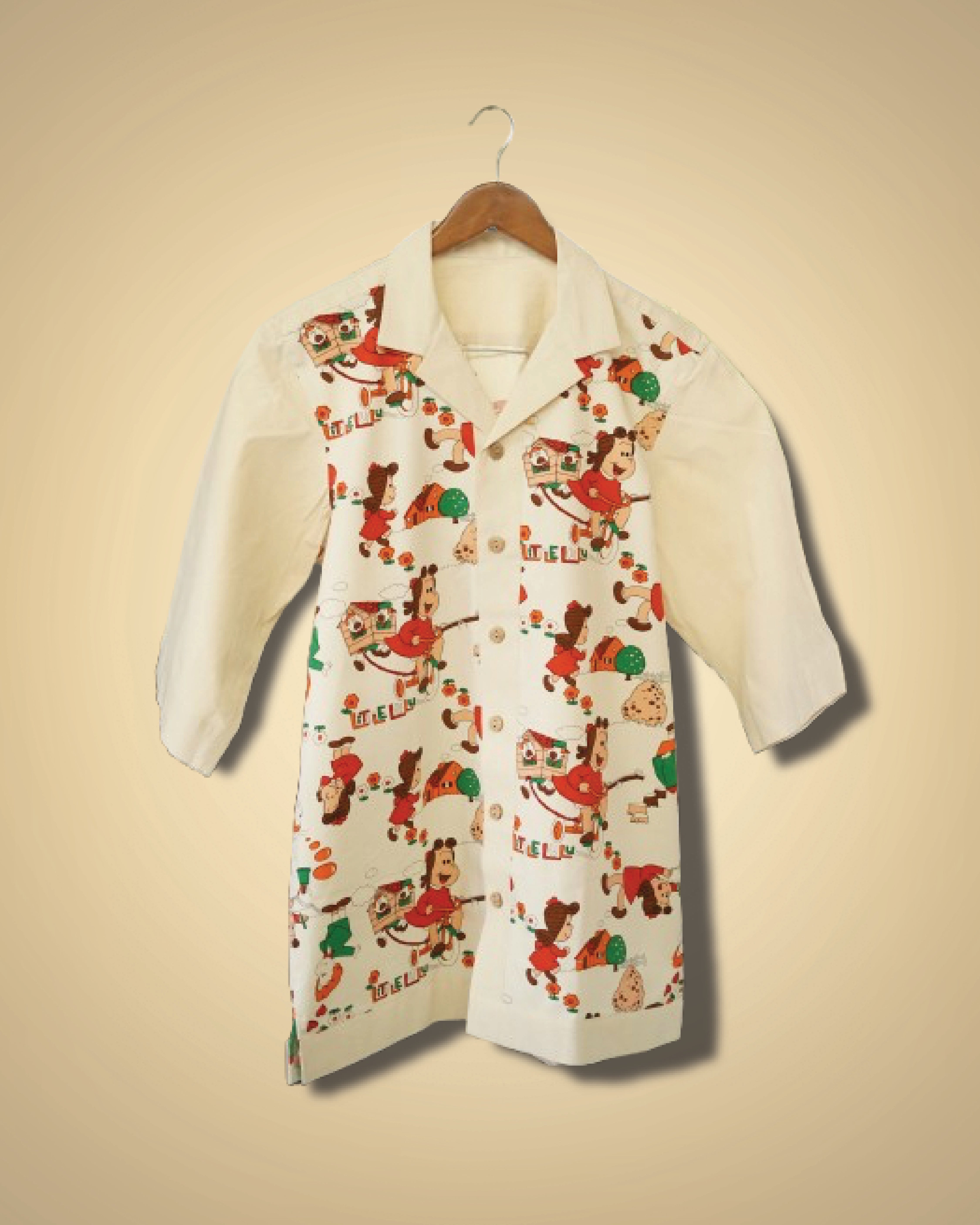 Tailored with creamy ivory panels, wooden buttons, and a Cuban collar, it blends kitsch with calm, comfort with character.