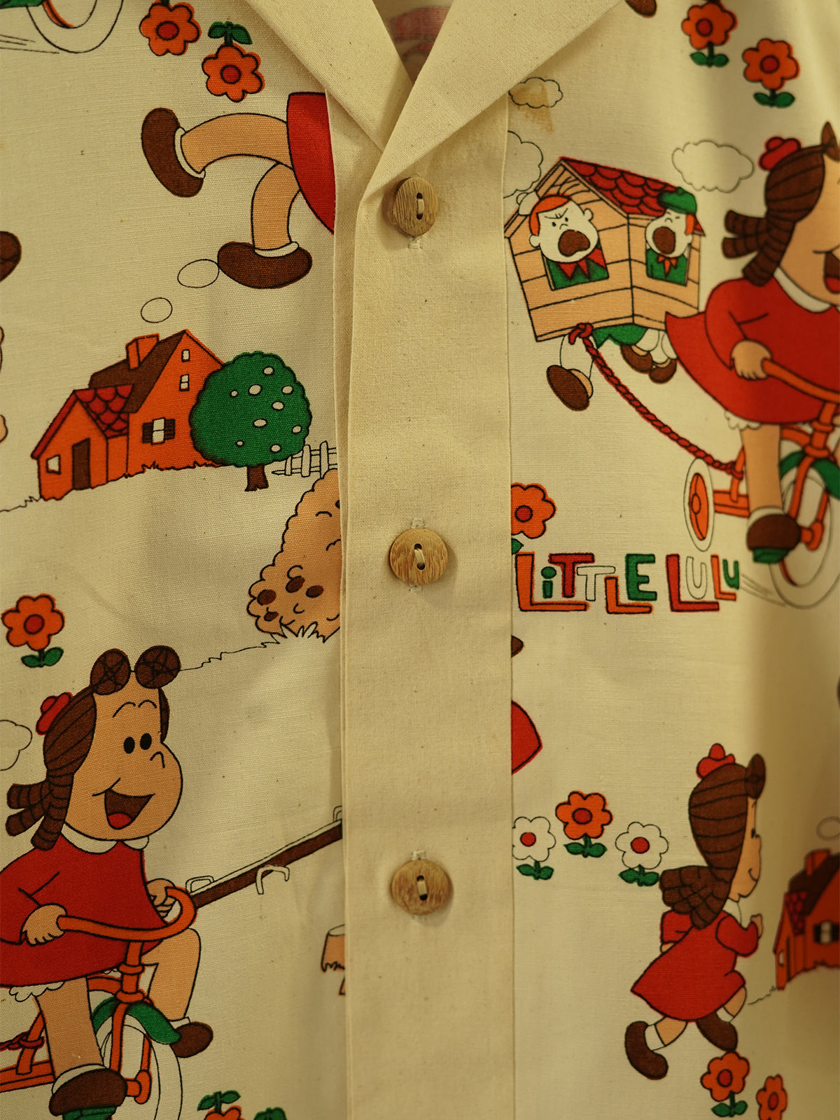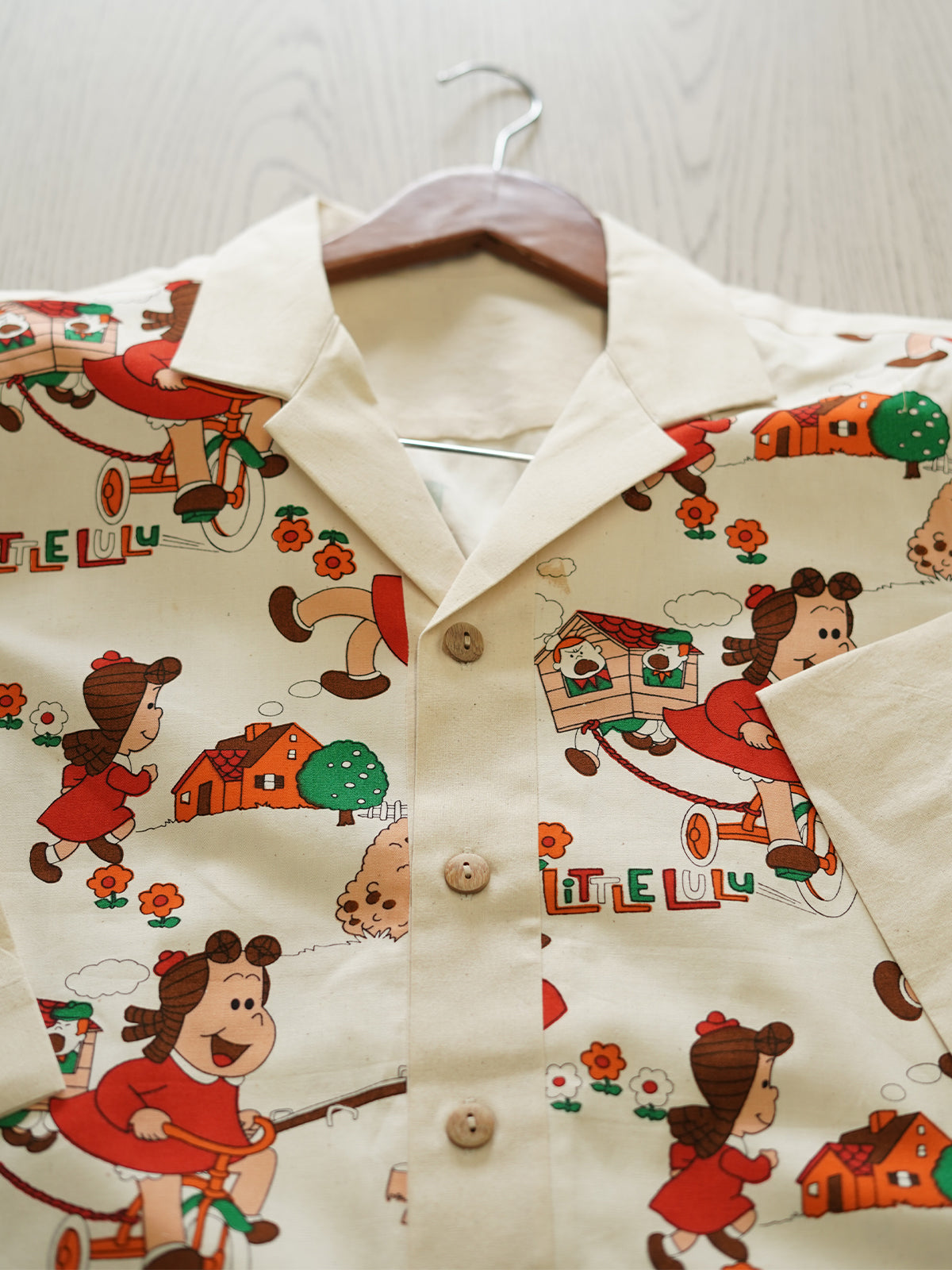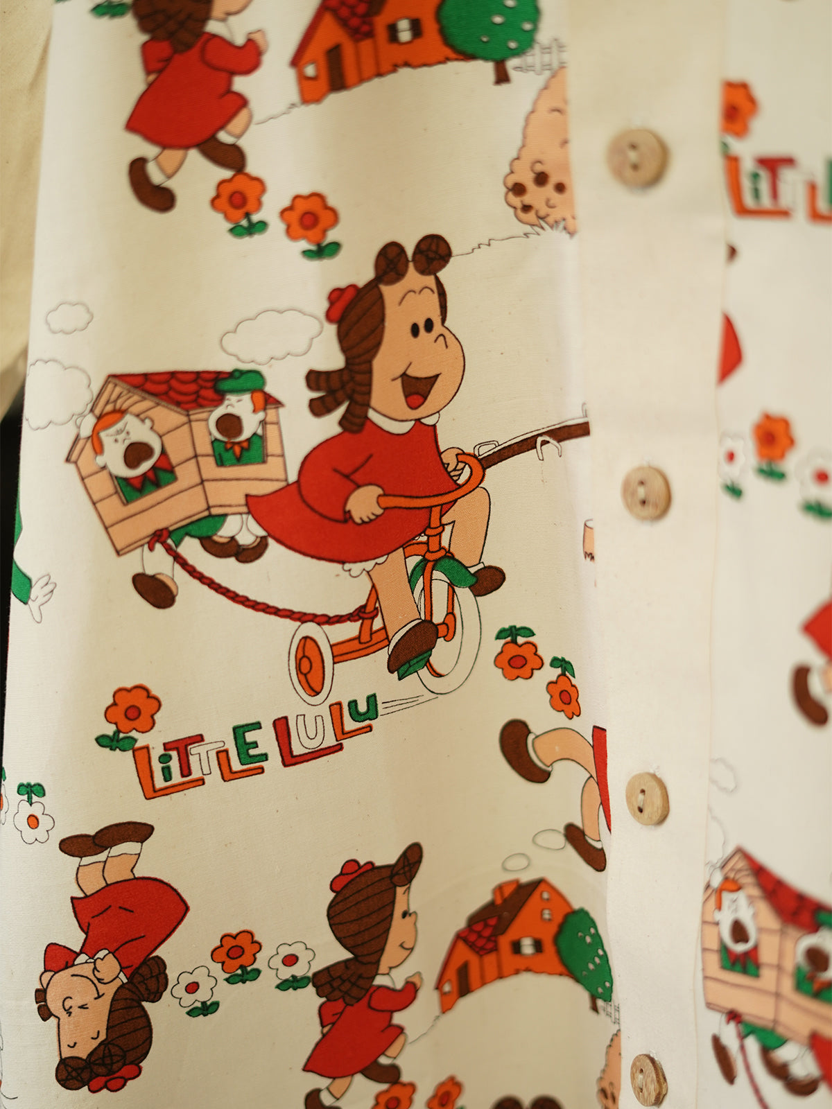 “Lulu’s Lane” is a joyful tribute to 90s cartoons, cassette culture, and chalk-drawn sidewalks. Featuring an ultra-rare vintage print of Little Lulu in a vibrant neighborhood scene — complete with flowers, doghouses, and bicycles — this shirt is for the dreamers who never really left childhood behind.
