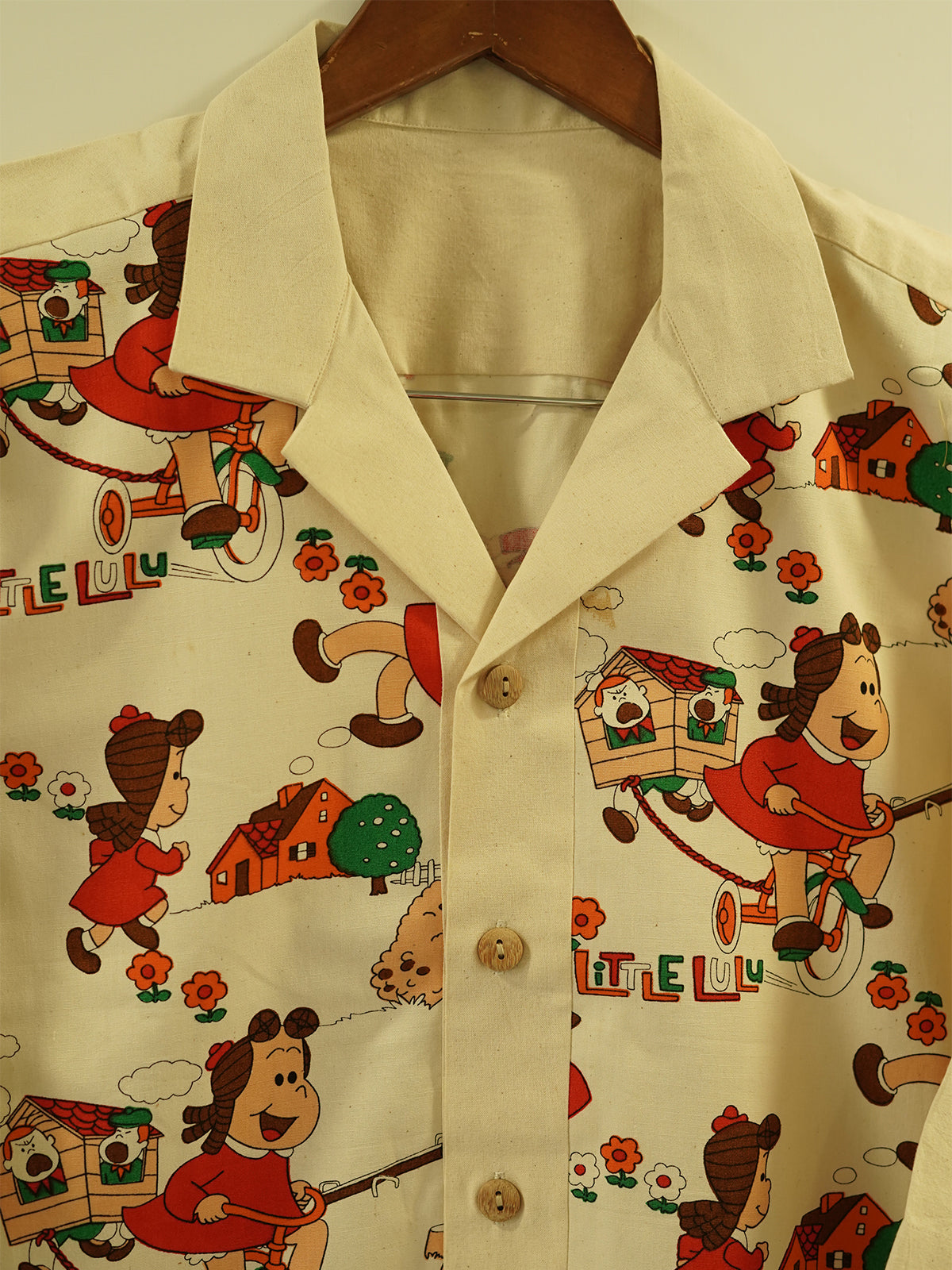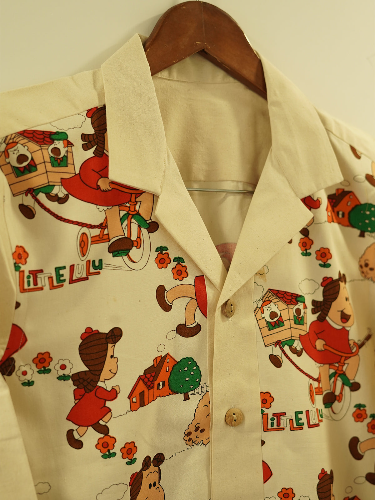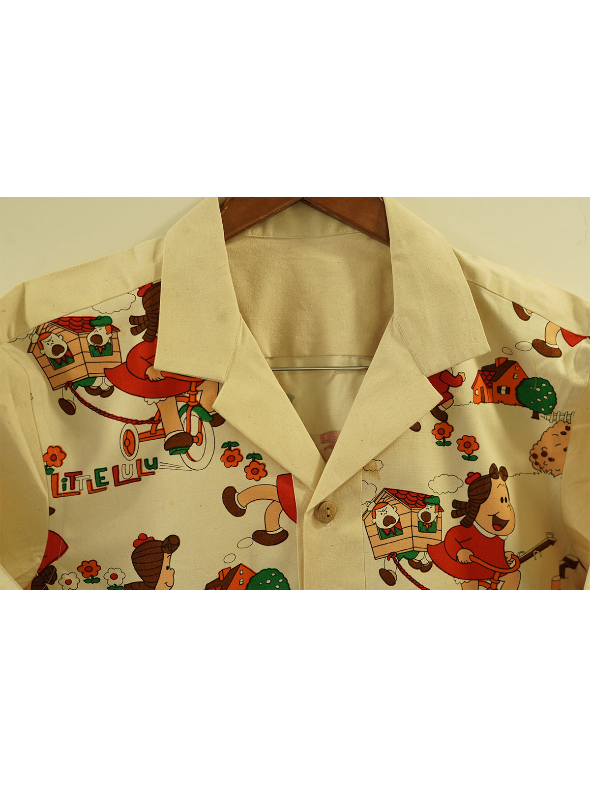 “Lulu’s Lane” is a joyful tribute to 90s cartoons, cassette culture, and chalk-drawn sidewalks. Featuring an ultra-rare vintage print of Little Lulu in a vibrant neighborhood scene — complete with flowers, doghouses, and bicycles — this shirt is for the dreamers who never really left childhood behind.